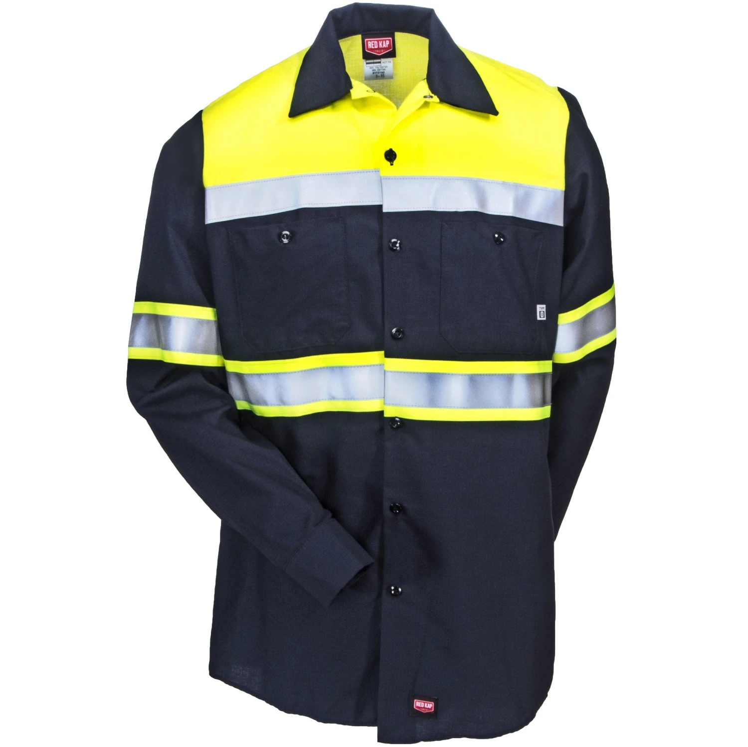 Professional, protective, and safe…you get it all with this work shirt. Red Kap uniforms are ready and willing to deliver when it comes to exactly what you need to get the job done. This durable ~Red Kap Colorblock Ripstop Men’s High Vis SY70 YN Long Sleeve Shirt gives you the high visibility protection you need with a professional button-down long sleeve polo style that also keeps you looking clean and crisp all day long. High visibility yellow color blocks with silver reflective tape against the navy blue Ripstop material is the perfect combination for anyone from foreman to supervisor to crew.